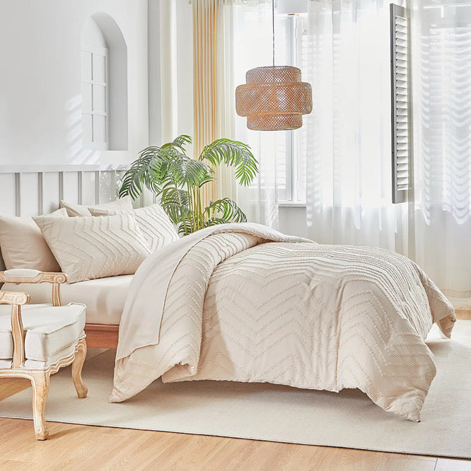 Un diseño bohemio moderno que transforma tu dormitorio en un espacio cálido y acogedor. Su textura capitoné y líneas geométricas aportan profundidad visual, mientras su relleno ligero brinda confort perfecto para todo el año.